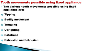 Removable appliances are orthodontic appliances that can be inserted and removed by the patient. Fixed appliances also referred to as braces are a combination of bands brackets and auxiliaries that can be used to move a tooth in six directions. Brackets can be constructed from stainless steel titanium ceramic or a combination of these.